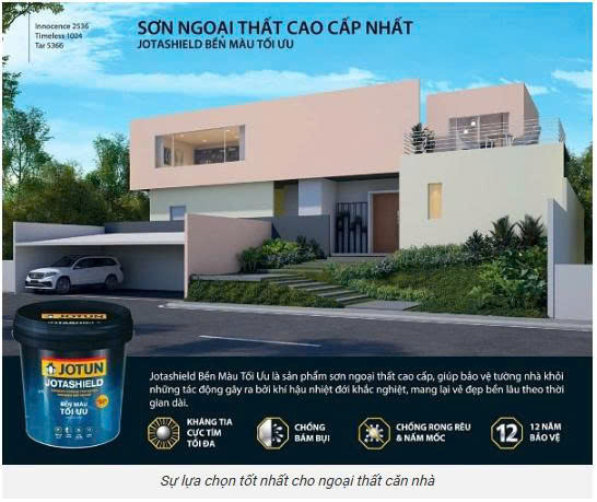 Sơn ngoại thất cao cấp của Jotun, Jotashield Ultimate, được tạo ra bằng công nghệ và nghiên cứu mới nhất để chống lại các điều kiện thời tiết nhiệt đới khắc nghiệt và bảo vệ ngôi nhà. Trong nhiều năm, ngôi nhà của bạn vẫn vô nhiễm. Sự lựa chọn màu sắc phong phú và các đặc tính vượt trội của Jotashield đã giúp nó trở thành sự lựa chọn hàng đầu cho các tuyệt tác kiến trúc và các loại sơn ngoại thất tốt nhất hiện nay.